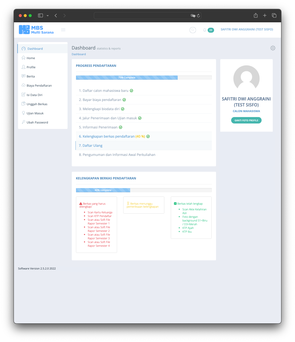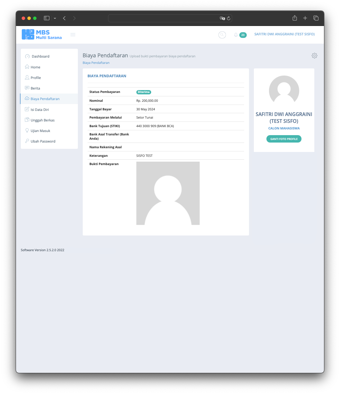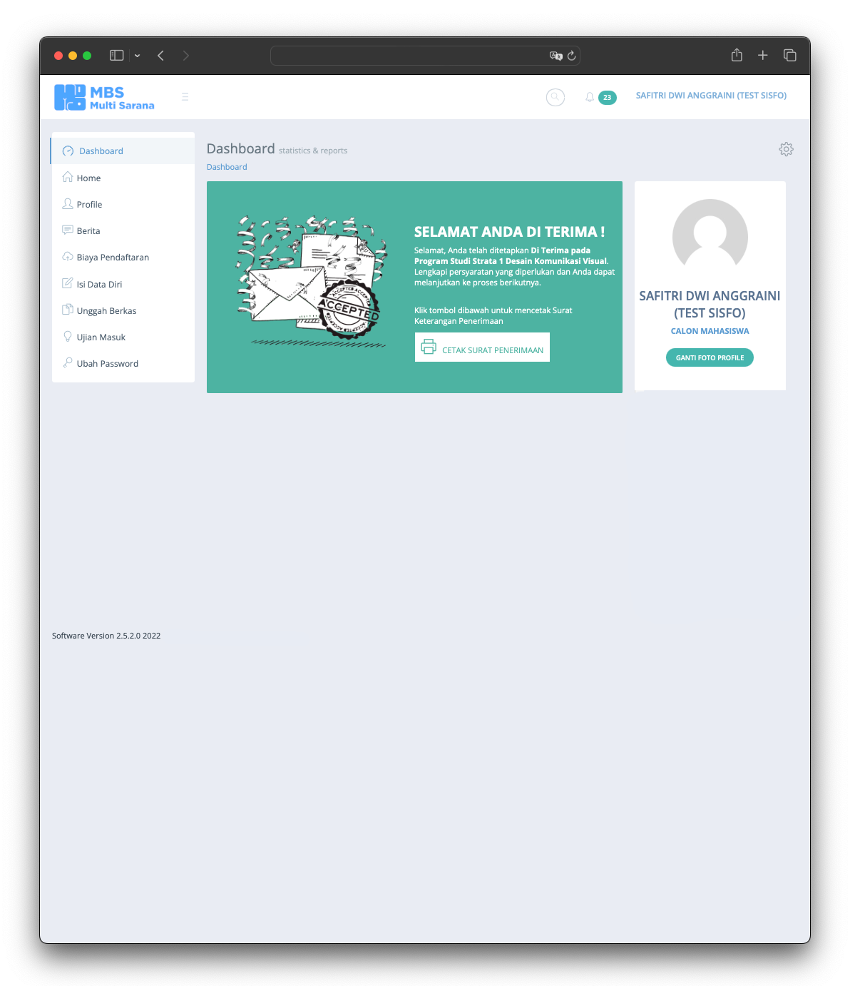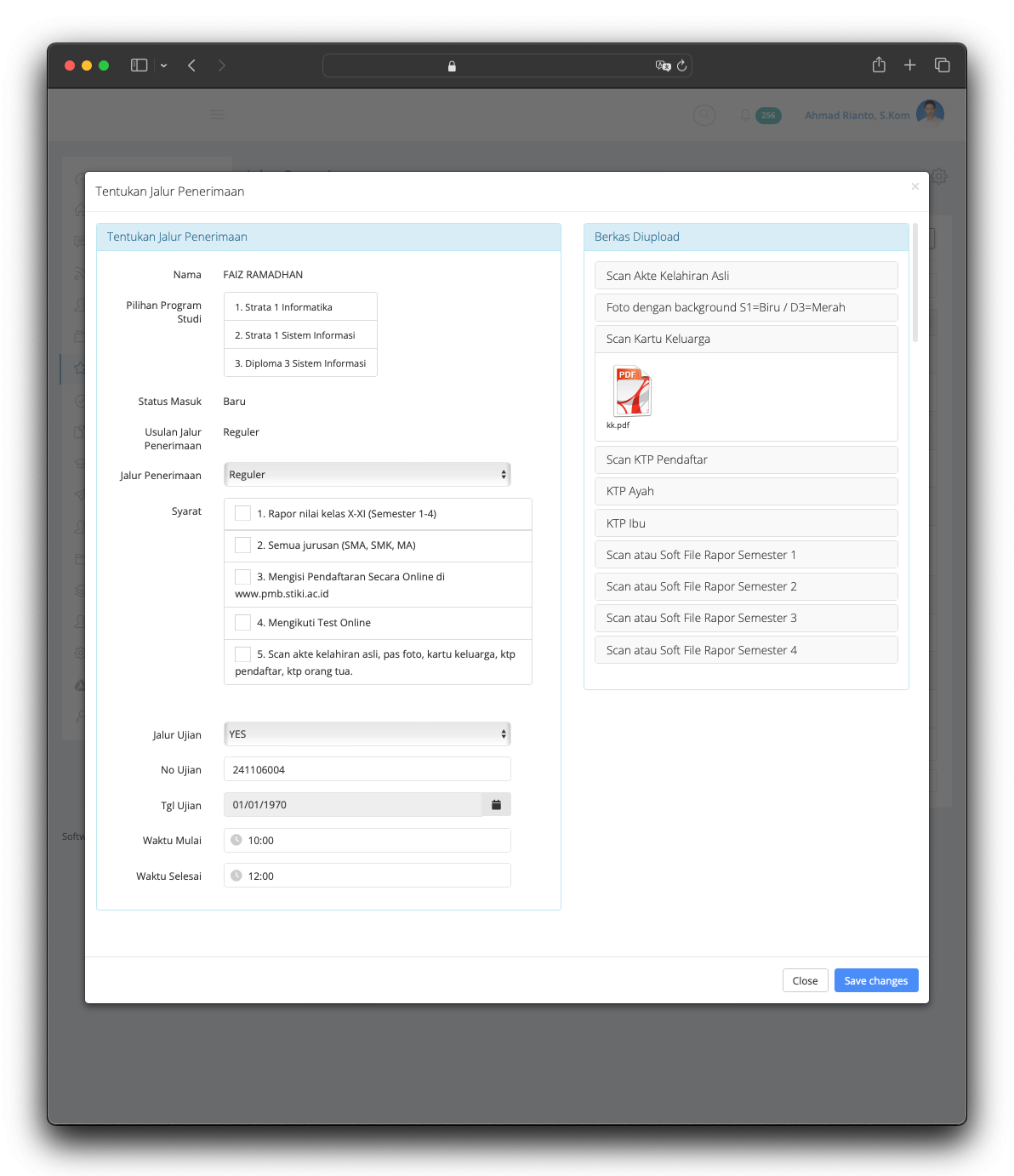 The Student Admission System is the information system used to serve users to register for the University. The application released in 2015 and still serve till today without any major issue. The application provide any needs of student and university 100% online from anywhere and anytime without require student to come to the office. The application allows students who live far away from the university to afford the registration without worrying about traveling far. The application manages everything such as registration fee, student data, required documents based on registration type, data validation, online test and scheduling, and last but not least integrating data into the Academic System.